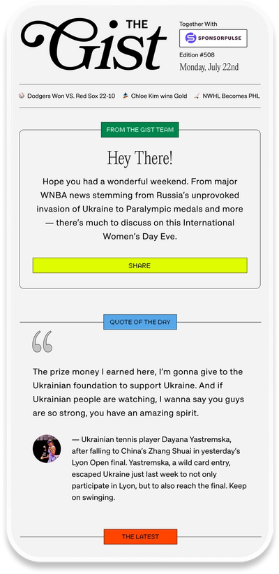 Get “the gist” of what’s up on the business side of women’s sports in less than 5 minutes every Monday, Wednesday and Friday morning.